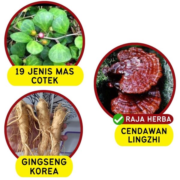 Gabungan 19 jenis mas cotek, cendawan lingzhi (raja herba) dan gingseng korea adalah bahan utama Jus ini.